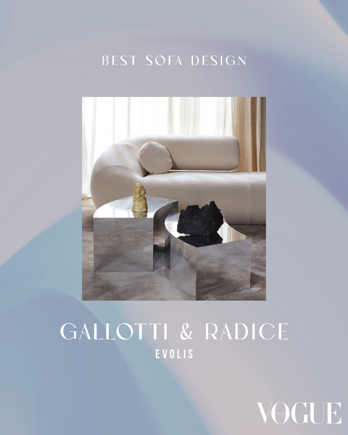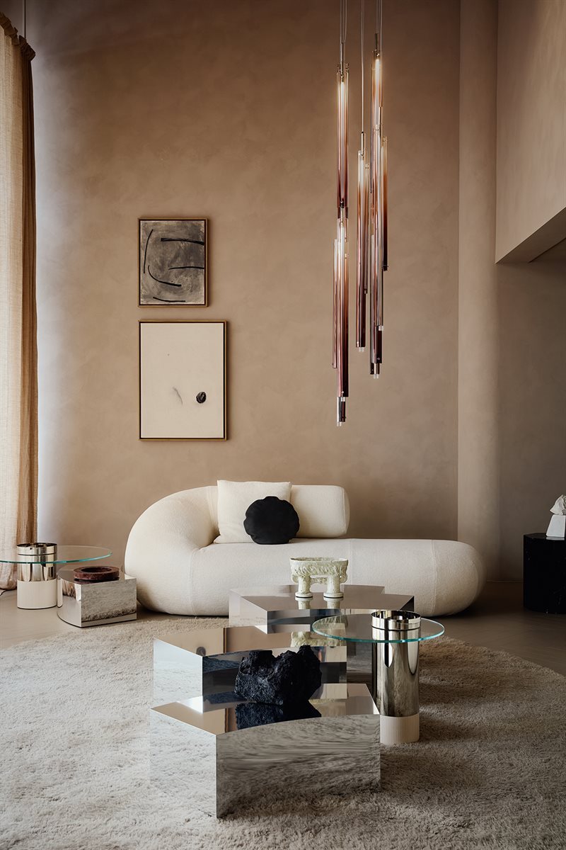 Embracing a futuristic vision, Evolis by bona fide Italian label Gallotti & Radice is derived from evolution. Designed by the acclaimed duo Martina and Massimo Castagna, who pioneered crystal glass furniture, this seminal sofa takes on a sculptural and serene form with an enveloping silhouette that balances comfort with presence. Their passion for experimentation, in a soft interplay of proportion and geometry, lends Evolis an artful gravitas.